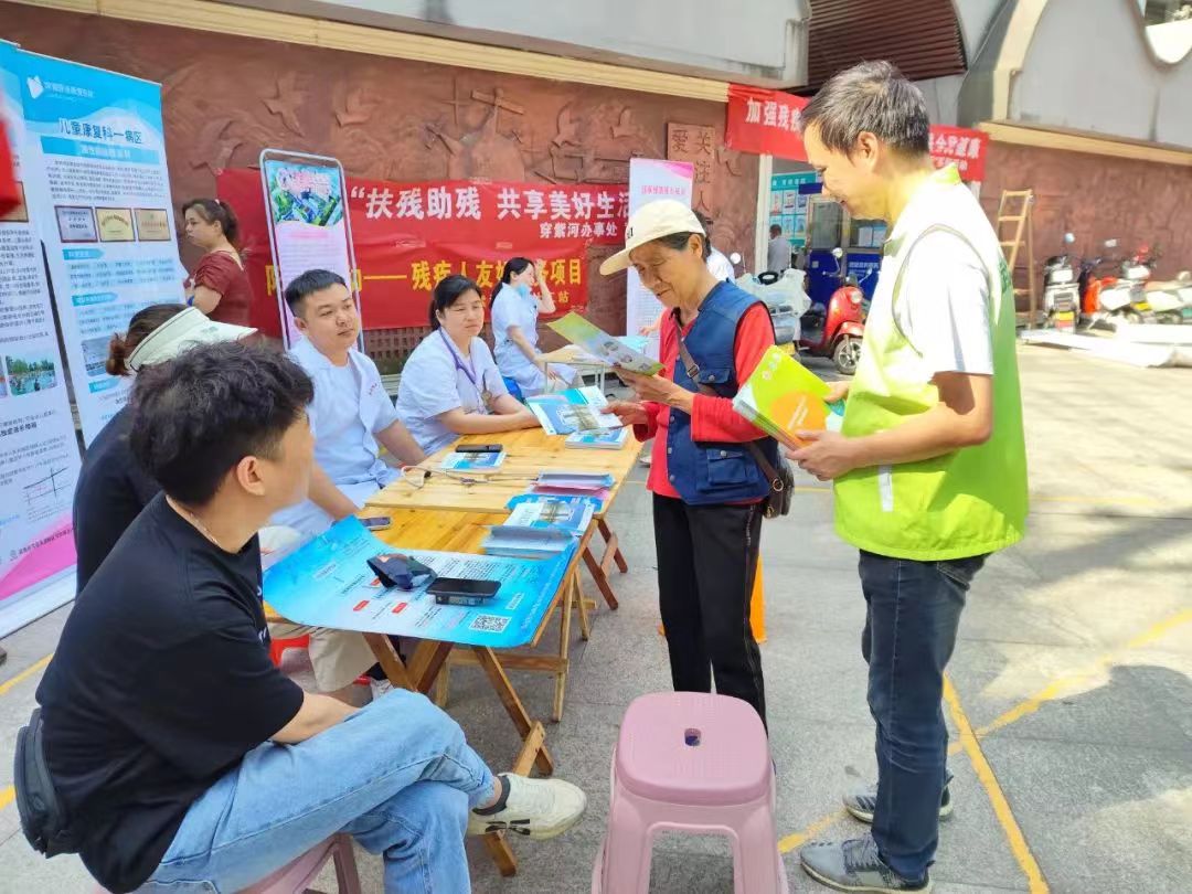 工作人员和志愿者们忙碌地布置宣传活动现场,各种宣传资料整齐摆放。前来参加活动的居民们络绎不绝,他们纷纷驻足观看宣传展板。街道社工、志愿者向居民们发放宣传单,普及残疾人的权利和义务,以及他们可以享受的优惠政策和康复知识。