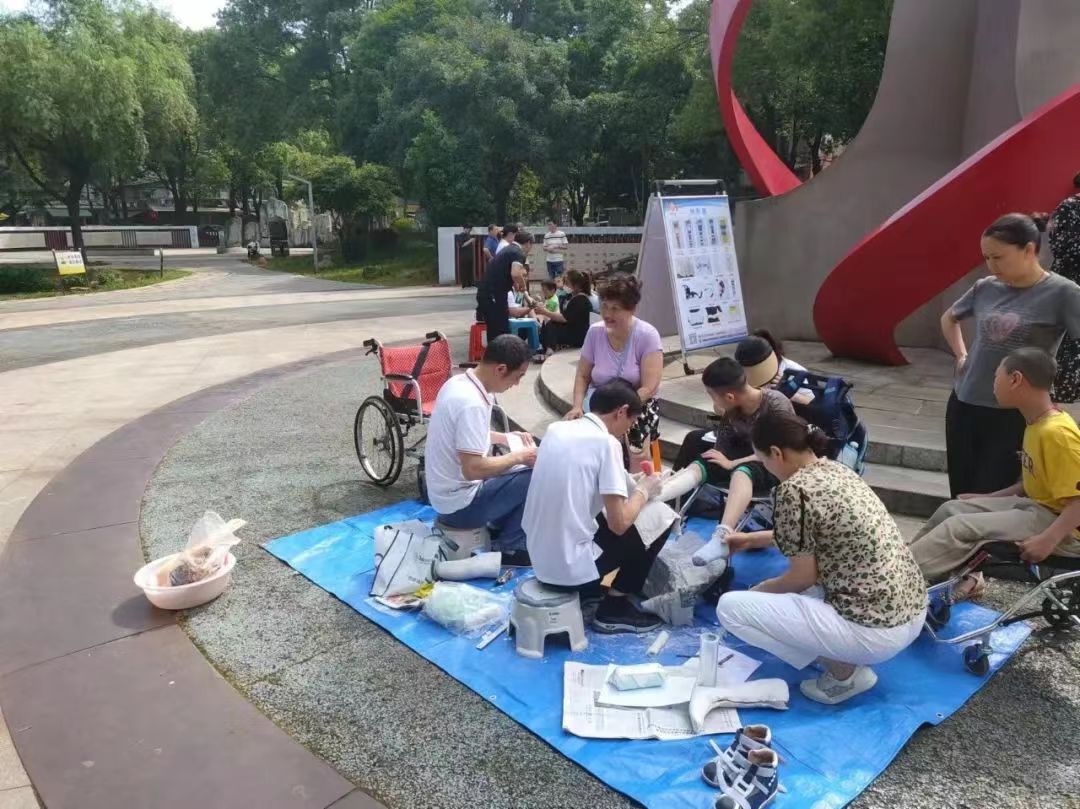 假肢适配现场,适配医师一对一的结合个人生活习惯和使用环境微调假肢和细心适配,确保假肢功能得到更大限度地发挥。同时还仔细为残疾人讲解义肢的日常护理及注意事项,并耐心解答他们关心的义肢佩戴等相关问题,确保他们顺利度过磨合期,更快灵活运用义肢,解决日常生活出行难问题。