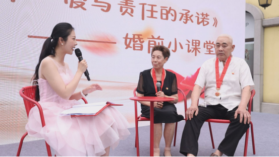 婚礼现场,金婚夫妇化身“幸福导师”,开设婚前小课堂,分享经营婚姻的宝贵经验,为新人们解锁幸福婚姻的密码。新婚课堂上,新人们集体观看“喜庆新规反铺张”教育视频。同时,婚姻家庭教育专家深入解读新颁布的《婚姻登记条例》及配套规范,为新人送上意义非凡的“家庭第一课”。