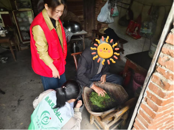 蒋爷爷家有手工制作的茶叶。他向社工介绍,他和老伴亲自上山采摘茶叶,保证茶叶的新鲜与质量,经过清洗、蒸制、揉捻、炒制等多道工序,才能制作出色泽翠绿、香气扑鼻的干茶叶。3斤湿茶叶仅能产出半斤干茶叶,希望后续进行协助进行销售。