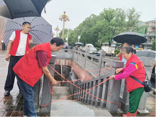 6月20日清晨,志愿者们早早来到集合点。他们平均年龄65岁,最大的已经76岁,虽然年过花甲,但个个精神抖擞,身着统一的红马甲,还有几名女志愿者也坚持参加,他们不顾自身安危,冒着大雨在澧水一桥至观潭花园3公里路段志愿巡逻。“快上来,水急危险啊”,正在石门一桥河边巡逻的李伯伯发现有2名居民不顾安危在河边捞鱼,连忙劝阻。同时主动在人行道入口处拉上红色警示带,提醒来往居民注意安全,不要在河边玩耍,看到居民不顾危险在河边捞鱼捞虾劝导迅速离开。“不要到河边玩耍,水大危险”简单的一句话不知道重复了多少遍,这一抹抹“银龄红”在河边勾起了一道温暖而坚实的风景线。