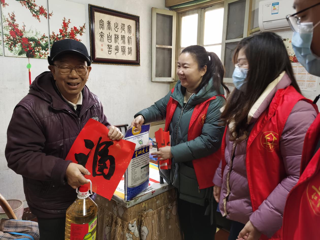 “今年因为疫情,子女们不能回家过年,原本以为要一个人过个冷清年,今天你们来给我送春联,太暖心,太感谢了。”家住味精公寓八十多岁的赵伯握着志愿者的手激动地说道。