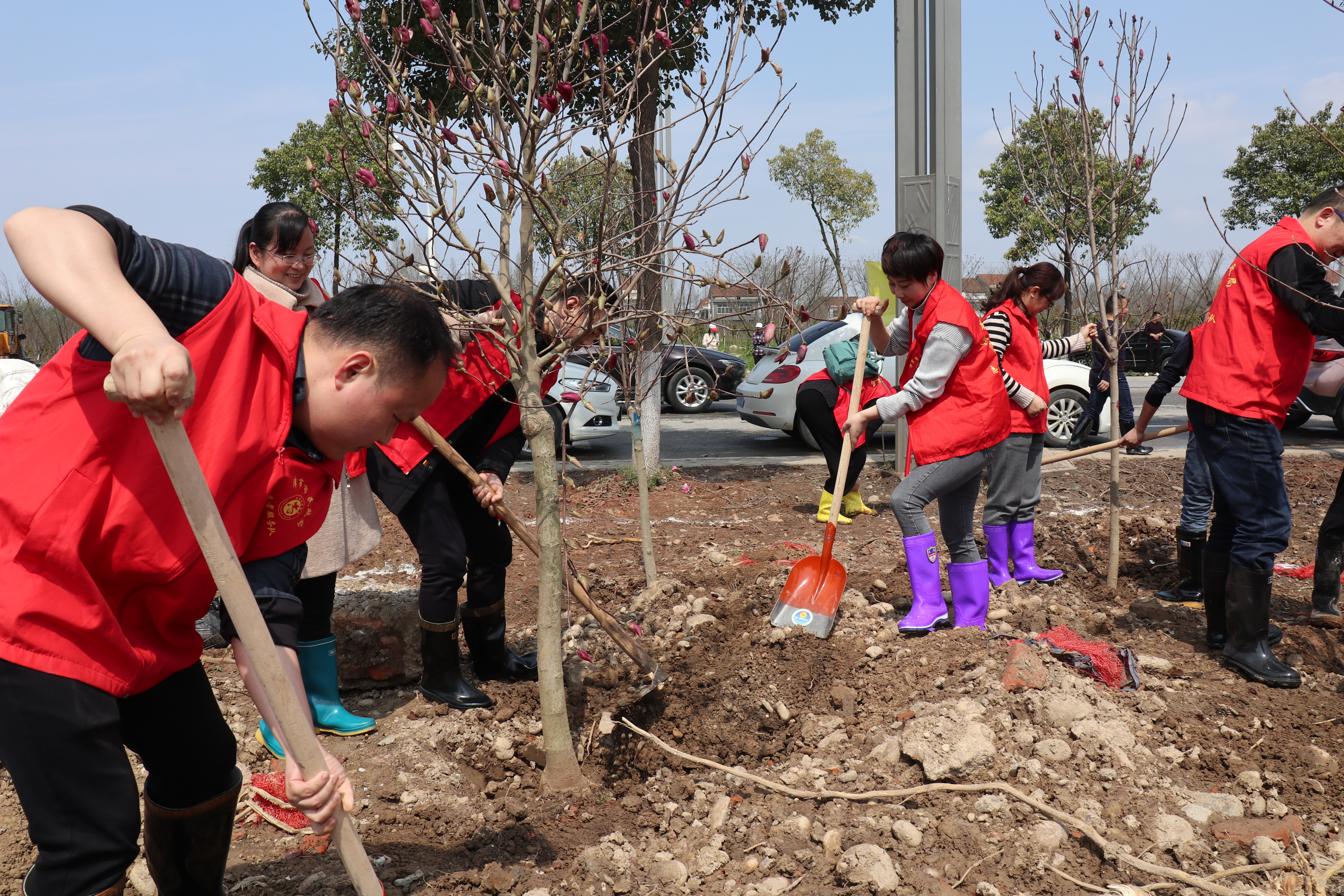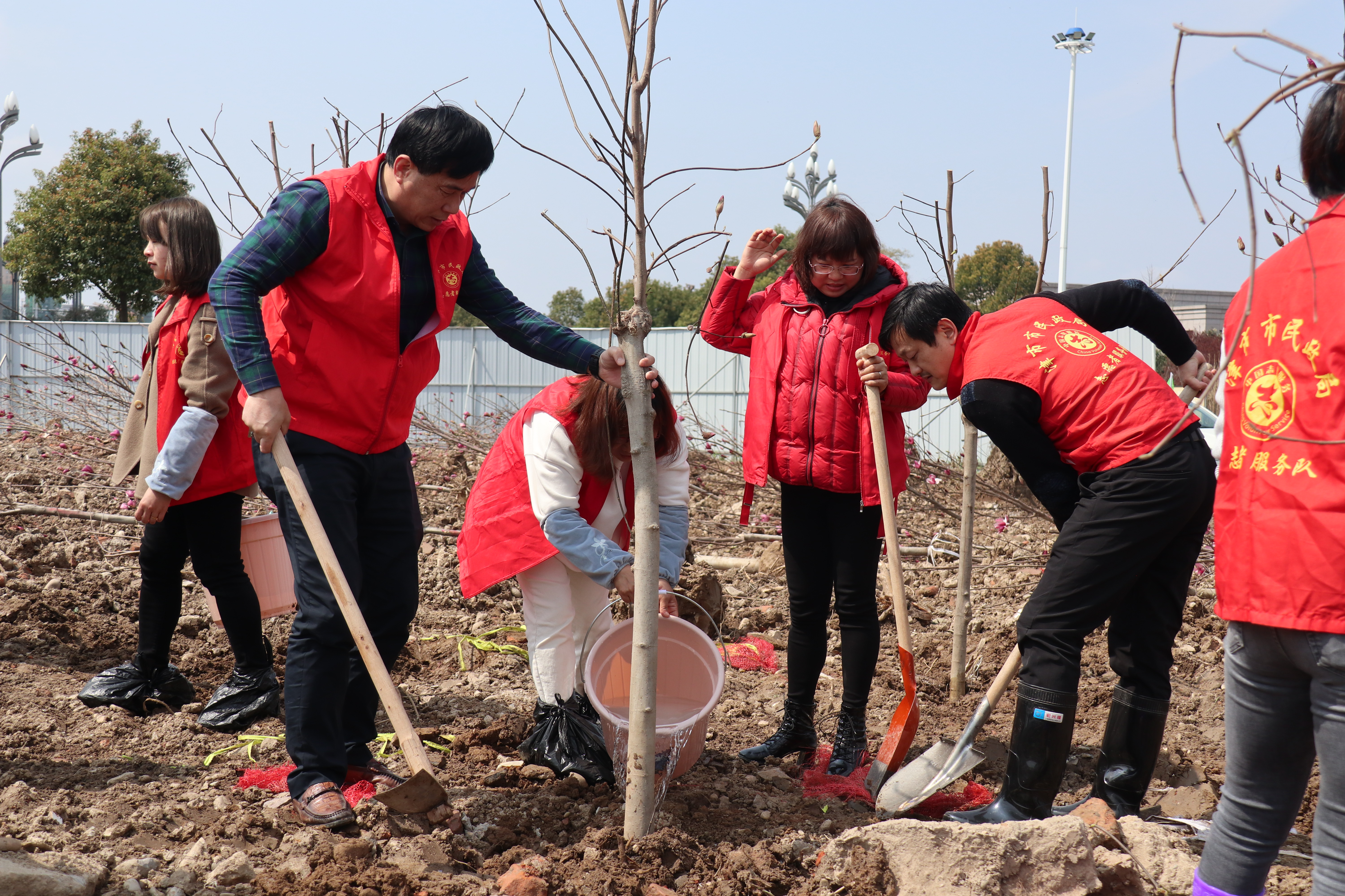 植树现场,参与植树的志愿者们齐心协力,干劲十足,有的挖坑、有的放树苗、有的培土、有的踩踏压实、有的浇水定根,各个环节有条不紊,到处都是忙碌的身影,场面十分热闹。一棵棵新栽种的树苗在大家的精心种植下迎风挺立,初春的土地被装点得生机盎然。
