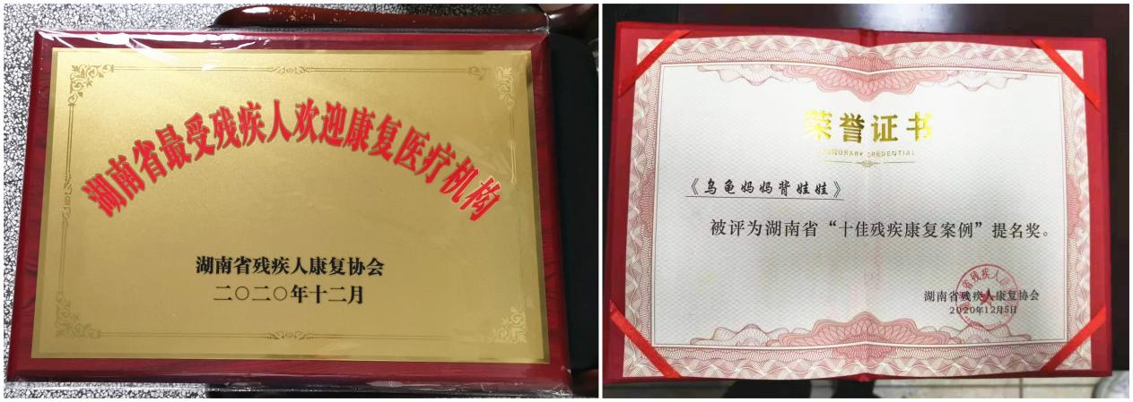12月9日,常德市康复医院儿童康复中心荣获“湖南省最受残疾人欢迎康复医疗机构”。据了解,全省共有400多家康复机构,由省残联专家评分及网络投票评选出最受残疾人欢迎康复机构17家。另外,儿童康复中心《乌龟妈妈背娃娃》被评为湖南省“十佳残疾康复案例”提名奖,全省共10个。